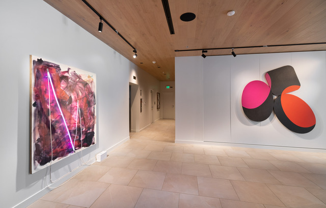 Mary Weatherford, purple lights, 2014, and Leon Polk Smith, Constellation Black Arrow, 1971