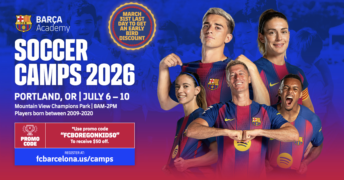 We will be hosting the official FC Barcelona Soccer Camp in Portland, OR, from July 6th to July 10th. The camp will take place at Mountain View Champions Park, running from Monday to Friday from 8 AM to 2 PM.