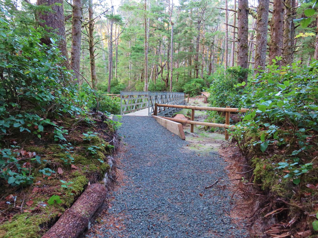 There are a few small wooden bridges along the way, which kids tend to love. No scrambling, no cliffside drop-offs, no technical sections. Just a steady, meandering path through towering Sitka spruce, salal, sword ferns, and thick moss that drapes like something out of a fantasy film.